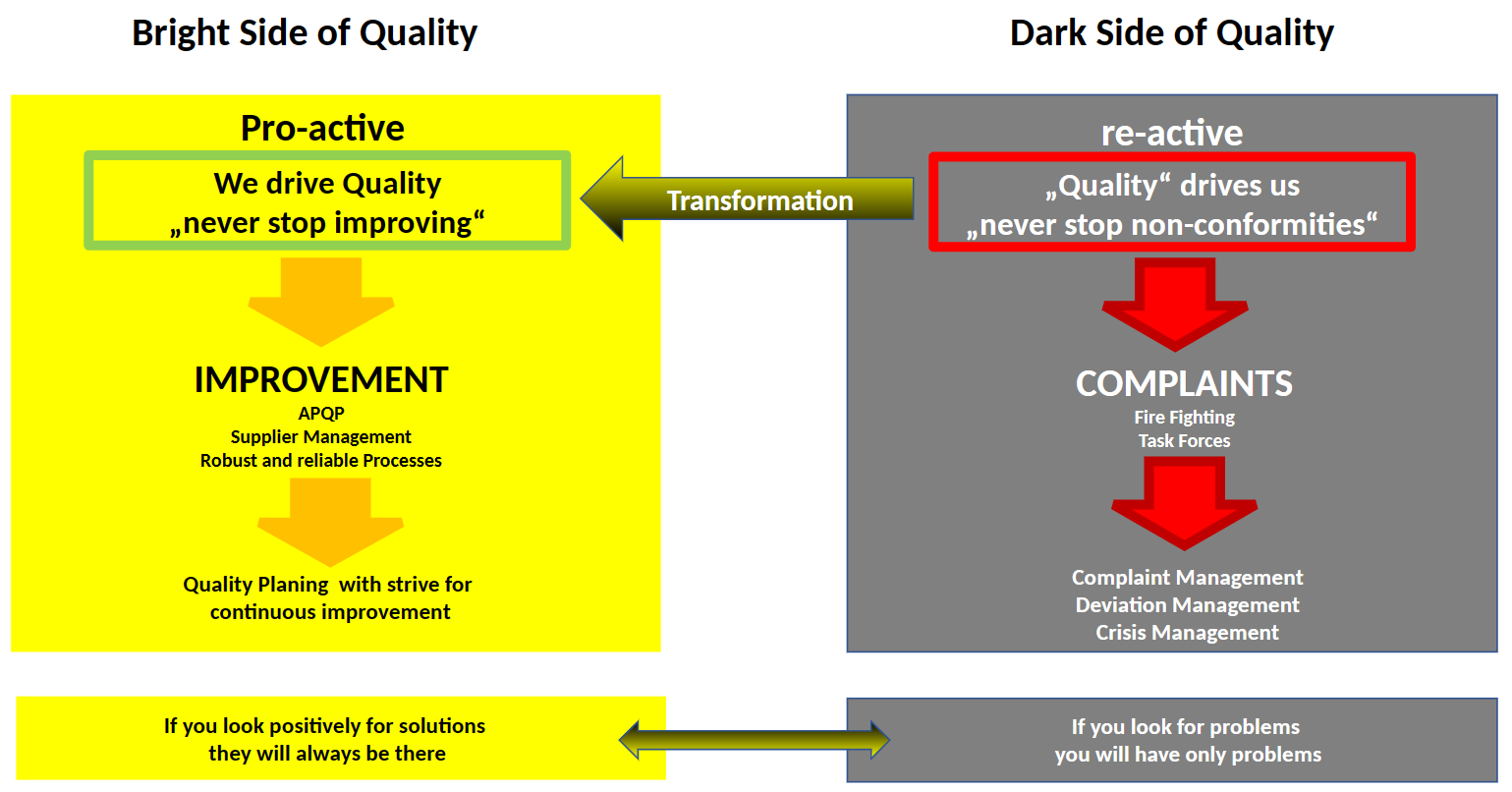 We recommend and are strongly convinced that Quality is a Mindset, what we call the “Bright Side of Quality”. Be aware that in the short term it will need more efforts in means of time and resources, however over the whole product lifetime, it will be the competitive advantage why customers will come back to you.